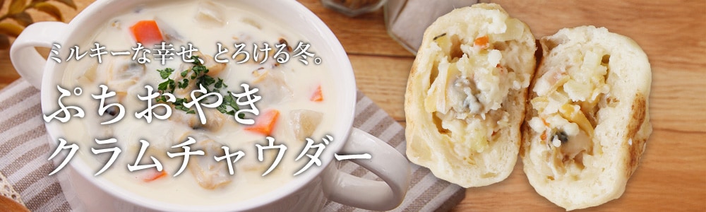 | 原材料 | 小麦粉(国内製造)、牛乳、あさり、玉葱、じゃが芋、生クリーム、白ワイン、ベーコン、人参、ホワイトルー、菜種油、発酵バター、コーンスターチ、砂糖、イースト、塩、チーズ/調味料(アミノ酸等)、酸味料、セルロース、酸化防止剤、(一部に乳製品・小麦・大豆・豚肉を含む) |